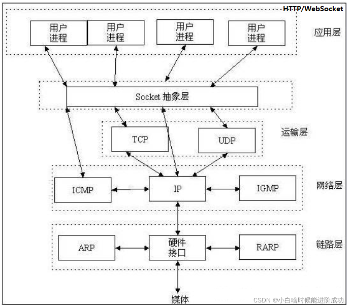 - 当两台主机通信时,必须通过Socket连接,Socket则利用TCP/IP协议建立TCP连接。TCP连接则更依靠于底层的IP协议,IP协议的连接则依赖于链路层等更低层次。