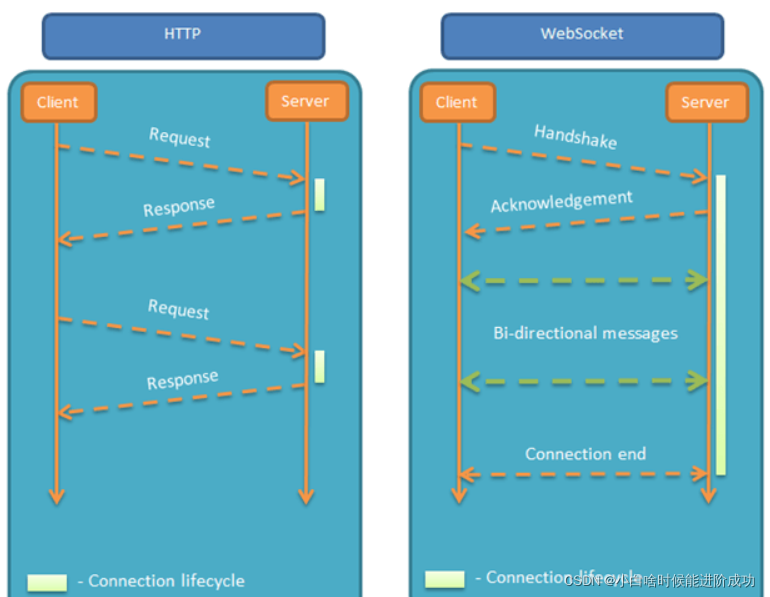 - WebSocket在建立握手时,数据是通过HTTP传输的。但是建立之后,在真正传输时候是不需要HTTP协议的。