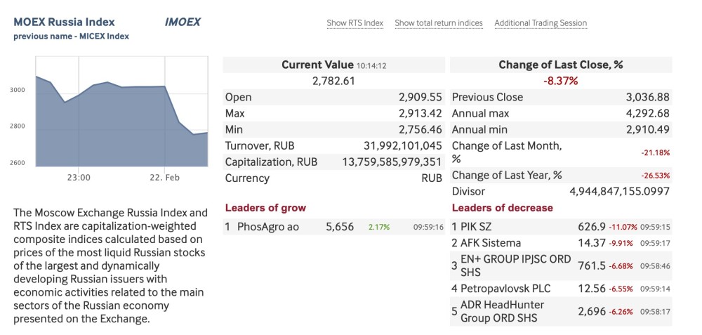 2月22日,俄罗斯MOEX指数跌幅一度扩大至逾8%,俄罗斯交易系统指数(RTS)跌幅超过10%。