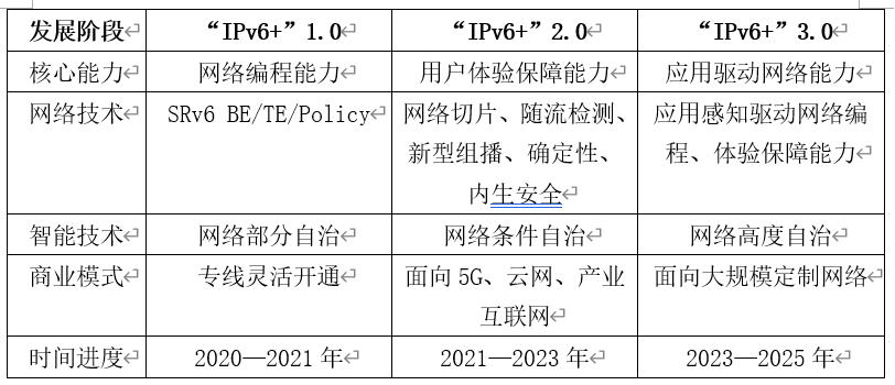 2019年,推进IPv6规模部署专家委员会指导成立“IPv6+”创新推进组,我国产业界提出打造“IPv6+”网络创新体系的战略发展目标,确定用8~10年时间,以推进IPv6规模部署国家战略为契机,建立可演进创新、可增量部署的“IPv6+”网络技术创新体系,引领我国“IPv6+”核心技术、产业能力及应用生态实现突破性发展,打造赋能数字化转型发展的新型网络信息基础设施,提供以国内外“IPv6+”系列标准为代表的网络演进创新方案。