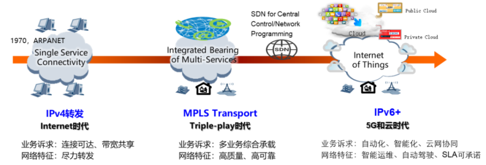 伴随着互联网的快速发展,TCP/IP技术体系取得了巨大成功,作为互联网的核心技术载体,IP协议从IPv4、IP+MPLS到IPv6经历了长期发展和演进。如今,随着5G、云计算等的出现,以及人人通信向物物相联、人机交互模式的转变,IP协议面临着新的需求,“IPv6+”应运而生,为IP网络创新发展打开了一条全新通道。