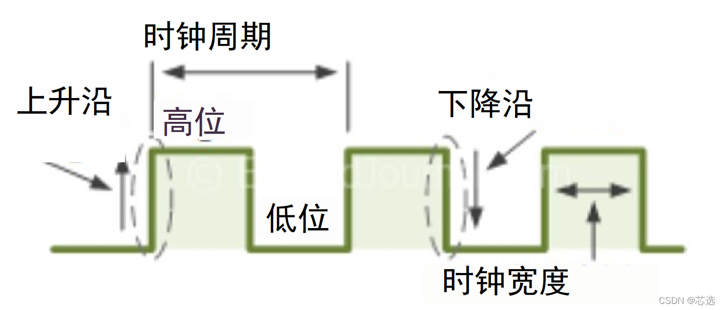 时钟线能持续不断将逻辑级别脉冲至高位和低位,每次脉冲之间持续时间“tb”以脉冲宽度来表示,如下图所示。大多数情况下,此持续时间“tb”为常量,等于单个比特持续时间。因此,时钟线能够生成如下所示脉动波形。时钟周期的时间段即包含高位时间段和低位时间段的一个完整周期所耗用的时间。