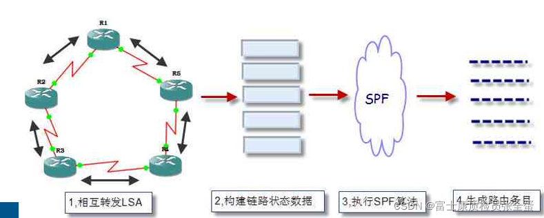 先用hello包发现邻居,发现邻居然后交换链路状态,交换链路状态之后这些路由器生成数据库,每个路由器里面数据库里面内容是一样的,也就是每个路由器都知道这个网络拓扑。最后每个路由器使用链路状态数据库计算到每个网段怎么走,生成路由表。