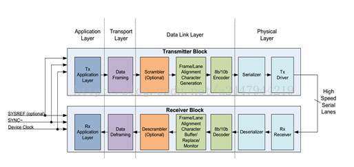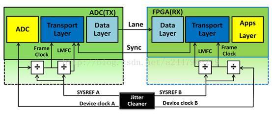 JESD204B需要给两端的发射设备和接收设备提供各自的同步时钟,也就是说他们都与外部的时钟同步,而不是直接相互同步,这样就间接实现了接收端与发送端数据比特的时钟同步。