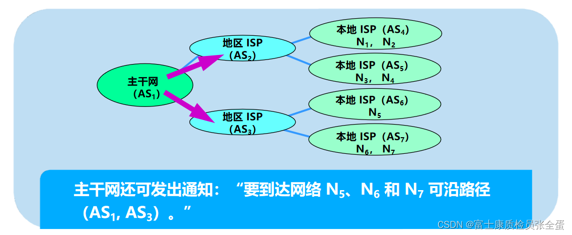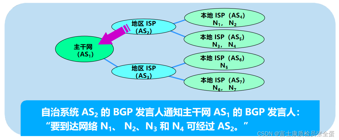BGP在通告路由信息的时候,就看到目标网段要过几个自制系统。不是按照条数和带宽来选择最佳路径,就是看过了几个自治系统。过区域最少的认为是最佳路径。
