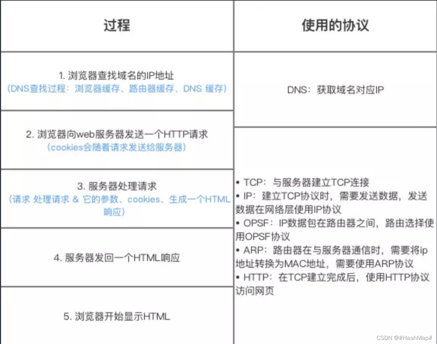 首先发给DNS服务器,进行域名解析,得到IP地址后生成针对目标Web服务器的HTTP请求报文,然后报文由TCP协议负责传输,为了方便通信,HTTP请求报文被分为报文段,然后每个报文段可靠的传输给对方,然后报文段由IP层负责一边中转一遍传送,服务器收到报文段后重组报文段,然后由应用层的HTTP协议处理请求的内容,请求的结果以 同样的方式进行回传。