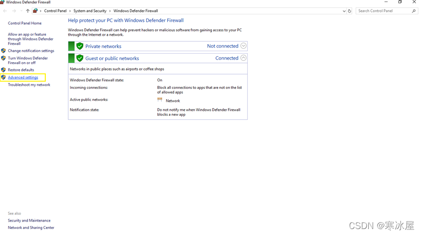 您将在控制面板中看到 Windows Defender 防火墙 窗口。单击左侧面板中的高级设置链接。
