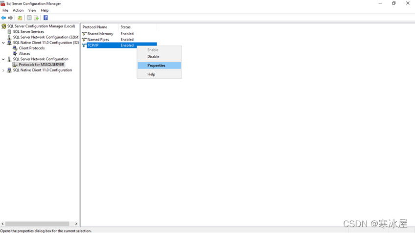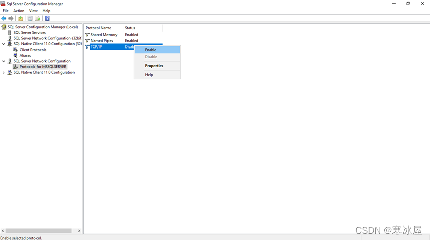 接下来,我们将为 SQL Server 实例启用 TCP/IP 连接。因此,右键单击 TCP/IP 协议并单击启用选项。