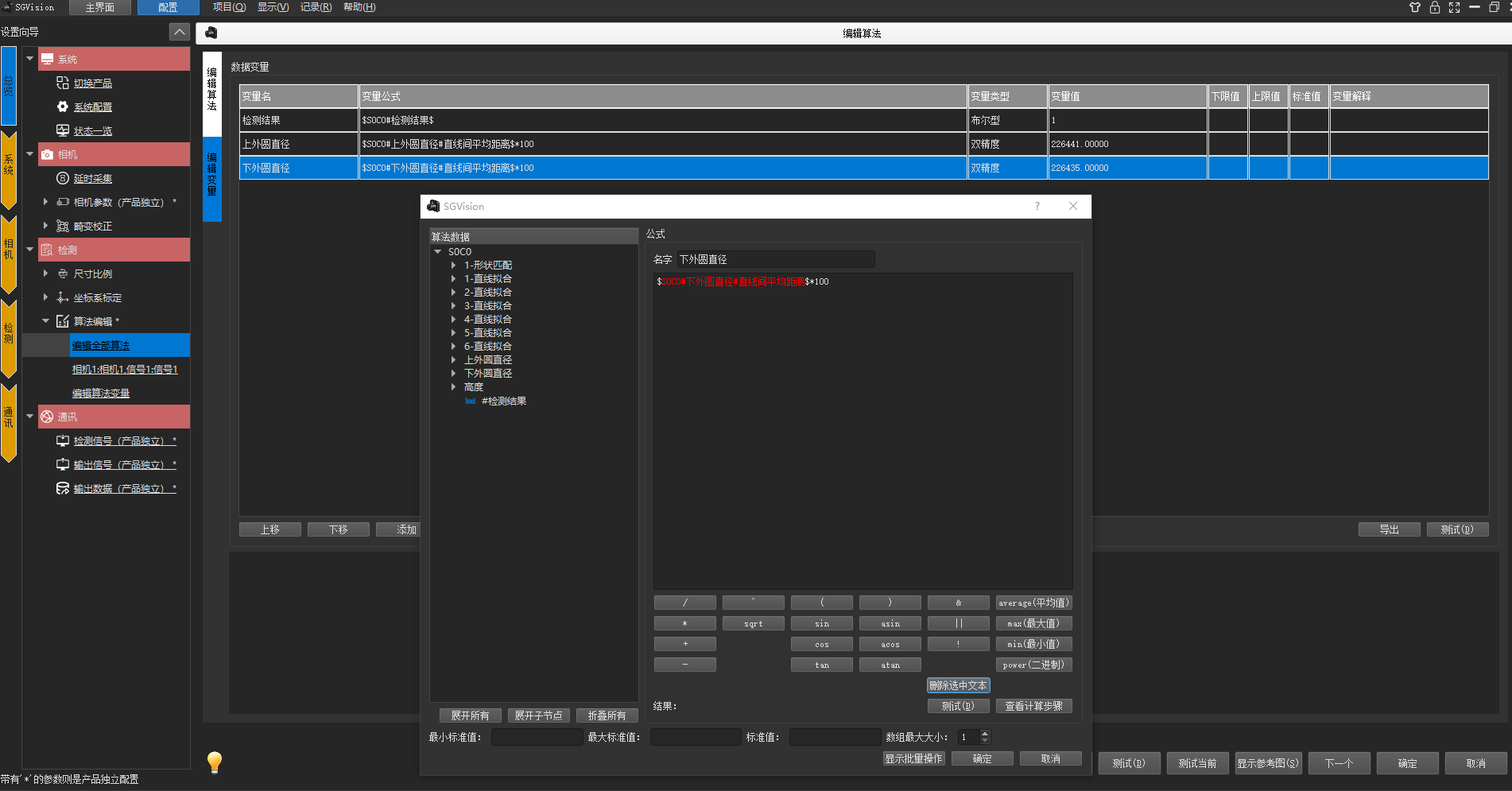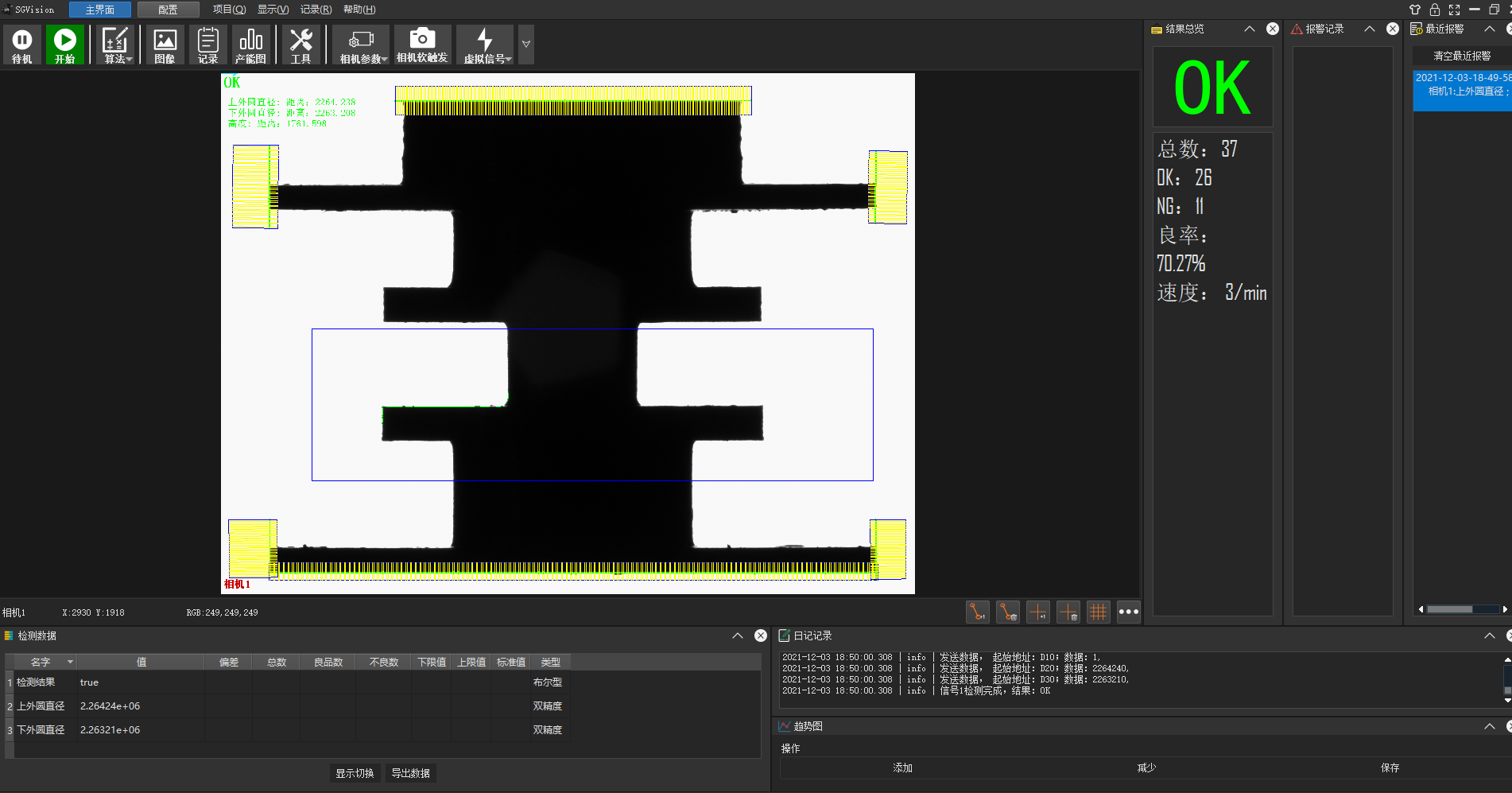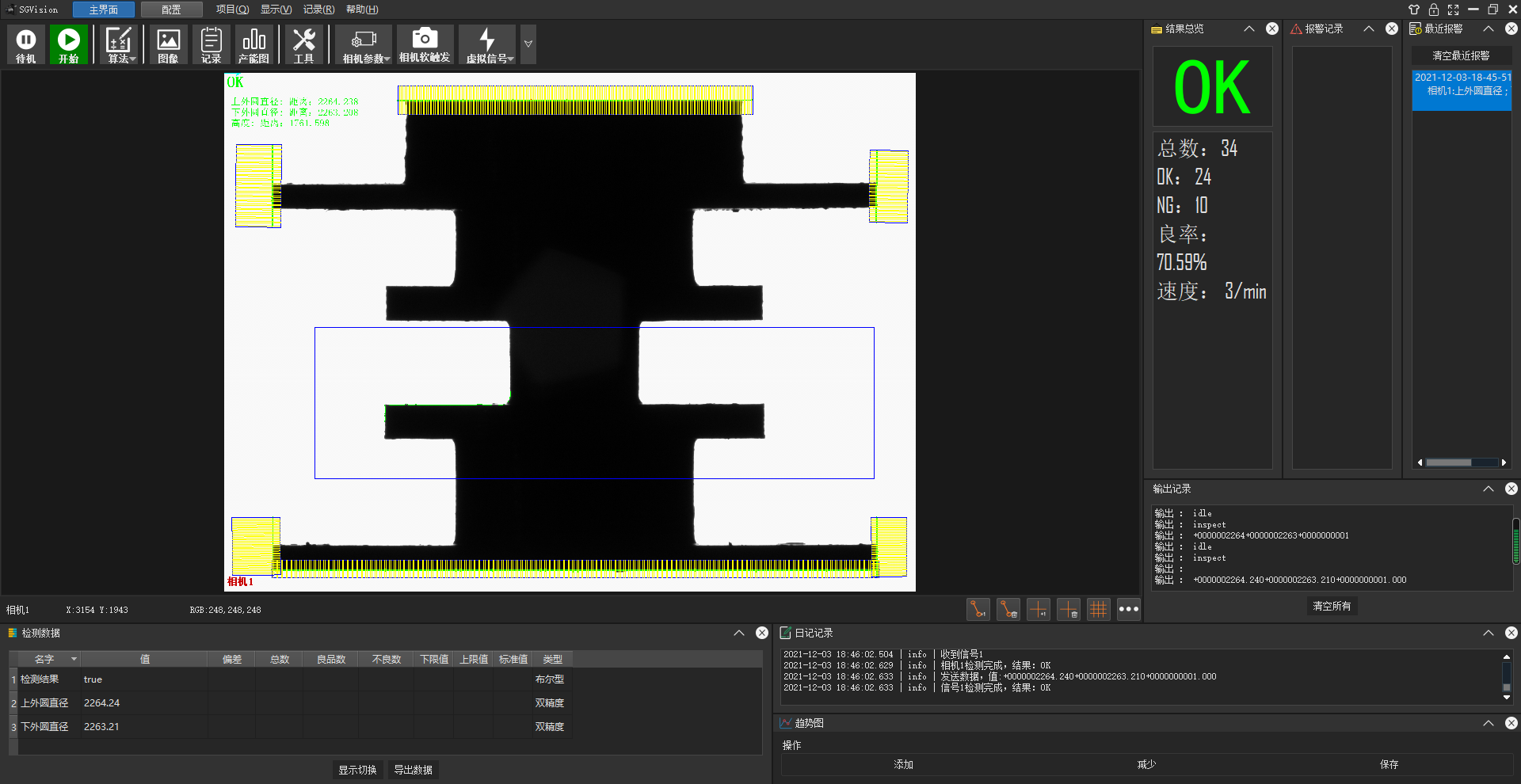 这两步基本上就设置好了,OK时上外圆直径、下外圆直径、输出检测结果。下面我们再来测试看看