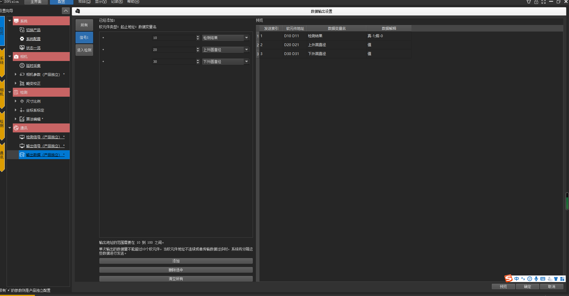 【输出数据】在这里添加需要输出的变量,选择输出地址。我的输出地址范围是10-100,从10开始在范围内选几个地址,填好之后预览保存就可以了。如果有用户需要只在OK或者NG的情况下输出数据,这个就需要到PLC 端写程序判断。