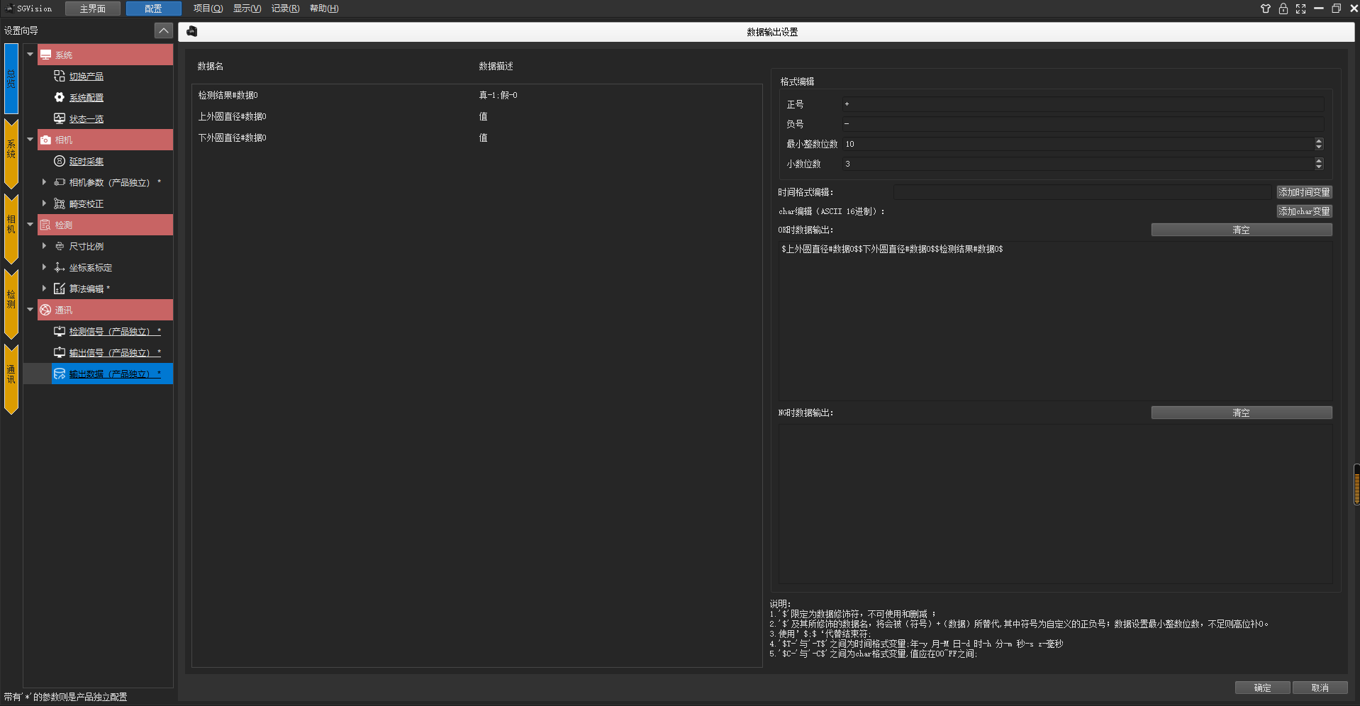 添加之后打开【通讯】的【输出数据】,在左侧的数据栏就能显示刚才添加的变量。右侧OK和NG分别可以添加在不同结果时需要输出的数据。添加方法直接选中OK时输出数据的添加框,双击右侧数据栏需要输出的数据即可。NG时输出数据同样添加。添加完成之后一定要记得确定保存。
