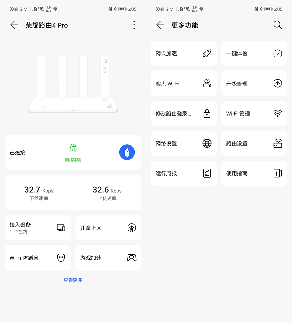 除了快速设置连接外,荣耀路由4 Pro也支持手机APP管理,目前APP改为了荣耀智慧空间,可以在APP上看到整个路由器的功能以及运行情况。