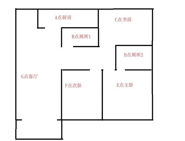 首先需要说明的是,G点和F点之间存在承重墙,另外B点的厕所和F点的次卧之间虽然连接带宽有些差异,但速度基本都能跑满,而E点主卧和D点厕所之间的情况和B点以及F点之间类似。所以我重点测试了A点厨房、C点书房、E点主卧、F点次卧、G点客厅阳台,另外宽带的速度是200M。