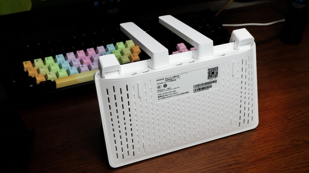整个荣耀路由4 Pro的设计还是偏向于家居轻薄型的,整个机身采用了白色,放在家里任何位置都比较百搭,四根扁平的天线采用的是折叠式的设计,非常便于收纳,天线上WiFi6的标识也表明了它支持WiFi6的网络,当然该天线的5Ghz频段也是支持LDPC的无线纠错算法,抗干扰也比较强劲。