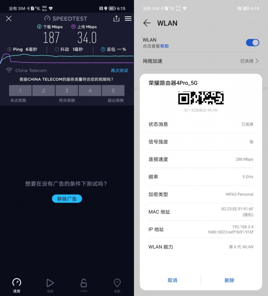 首先毋庸置疑的F点,得益于160mhz以及1024QAM的加持,加上荣耀60 Pro本身的硬件,满速满连接下最大连接来到了2401Mbps,完全能跑满200M外网宽带。