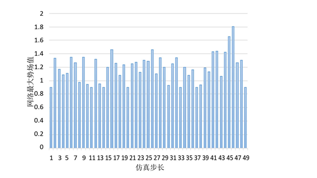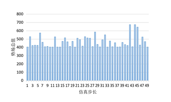 从仿真结果来看,转弯角度总值分布比较平稳,势场总值也比较平稳,网格势场最大值、势场标准差除初始外趋于平稳,无人机在子区域内能较好的生成预测性较小的航路。