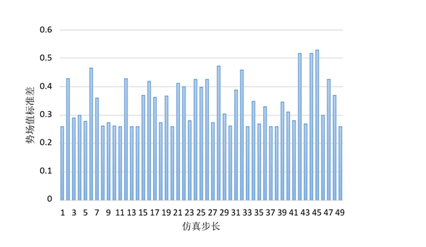 为了反映对网格监视间隔的大小,我们提出了一种势值动态增加的机制,也就是在计算推进的过程中,所有网格的势值也在同步增加,但是刚刚覆盖过的网格的势值清零,这样,在计算过程中,网格的势值就与监视间隔的大小成正比,如果网格监视间隔时间大,则网格势值的增加就多。这样,就可以用网格的动态势值来评价对网格监视间隔。因此我们利用任务区域网格势值的总值、标准差来评价监视覆盖的效率。