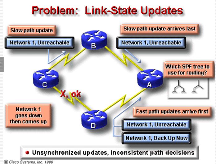 - 具有不同LSA集的路由器根据不同的拓扑数据计算路由。