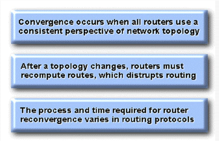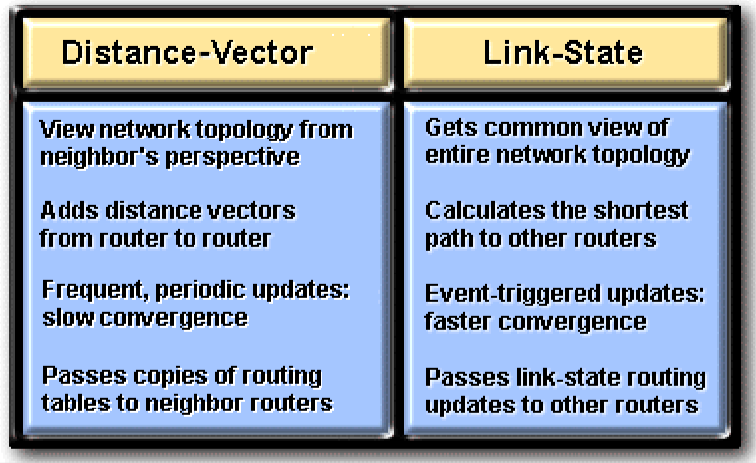 - 在大多数情况下,运行链路状态路由协议要求路由器比距离矢量路由协议使用更多的内存并执行更多的处理:需要CPU进行计算