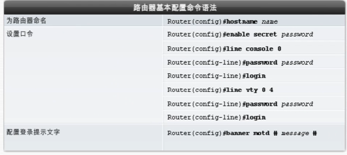 - banner:配置登录提示文字:一般会写路由器是谁用的,干什么用的,谁登录是非法的。