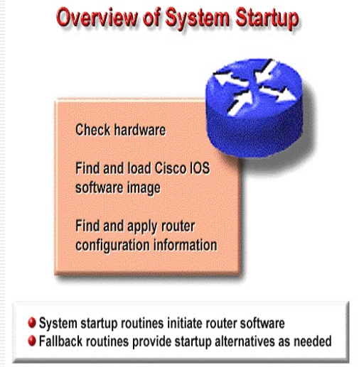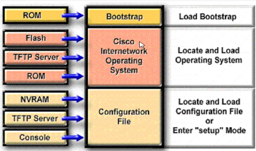 - 执行开机自检(POST):在此自检期间,路由器从所有硬件模块上的ROM执行诊断:如果有问题导致操作系统无法重启,那么我们就需要对硬件进行检查