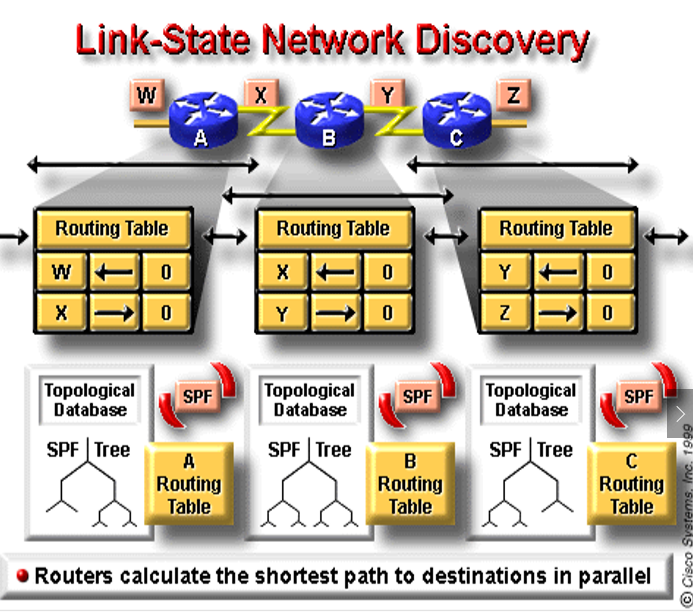 - 基于链接状态的路由算法也称为SPF(最短路径优先)算法,维护复杂的拓扑信息数据库:对树处理路由表,没有环路问题