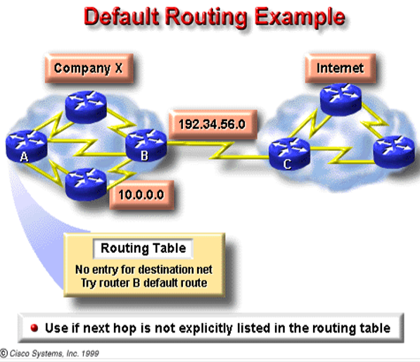 - 如果路由表中没有目标网络的条目,则将数据包发送到默认网络。