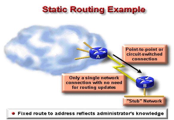 - 当只有一条路径可访问网络时,到网络的静态路由就足够了。(默认路由,将B所有不知道位置的全部交给A,由A去进行访问)