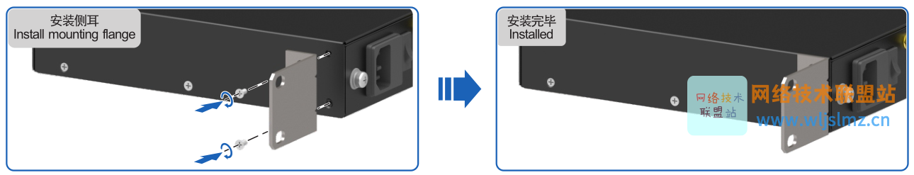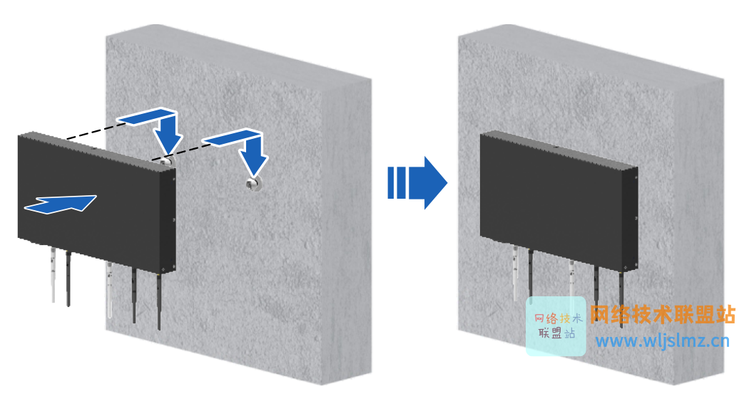 - 安装时请将设备的网口朝下,设备带通风孔的两个侧面与地平面垂直。