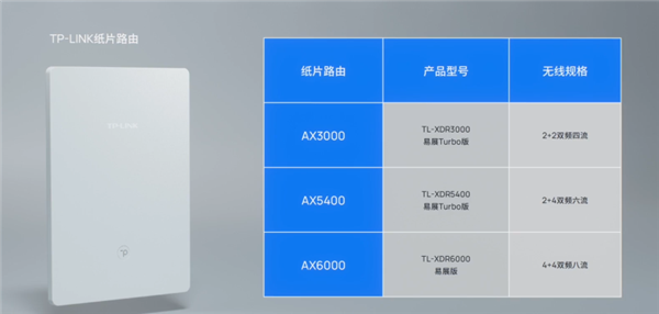 TP-LINK纸片路由使用了AX3000、AX5400、AX6000三种高规格Wi-Fi 6硬件方案提升无线扩展性能,无线规格可选双频四流、双频六流和双频八流。