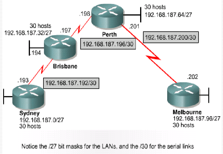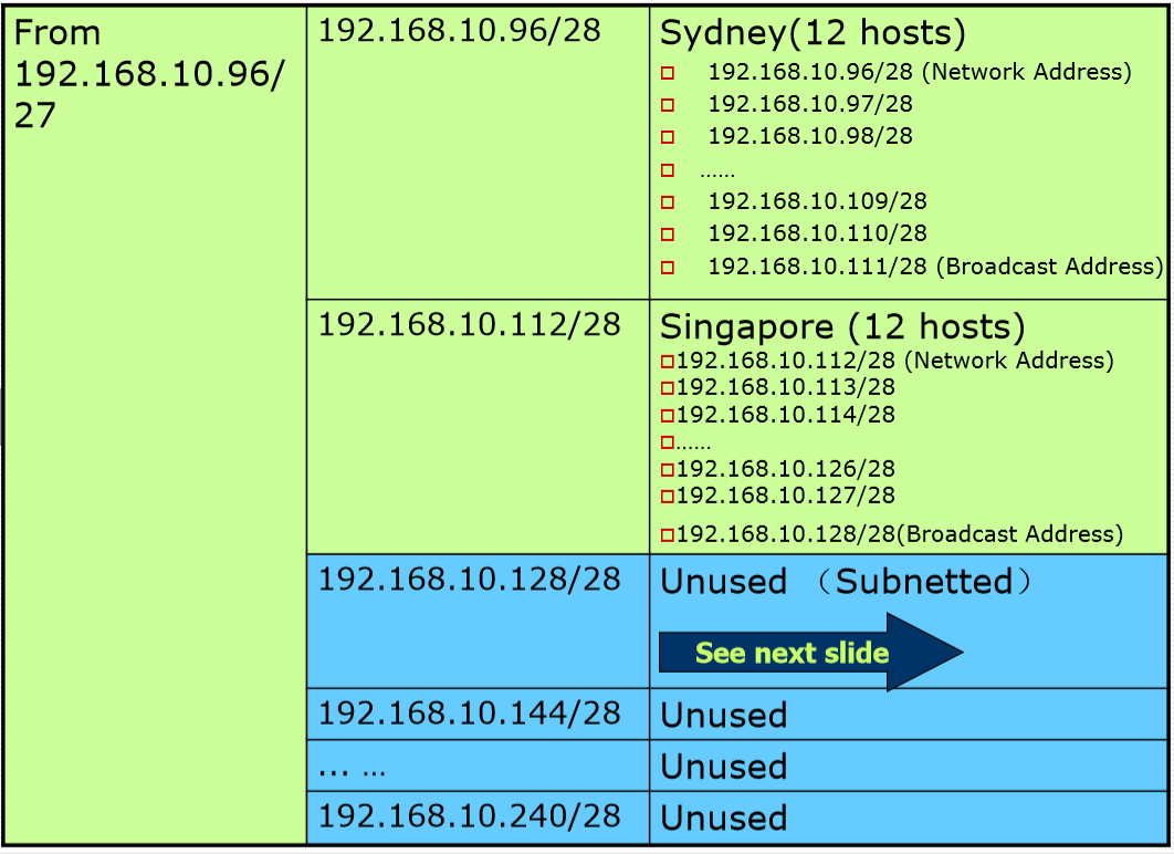 - 现在,悉尼和新加坡分别需要12位主机号。 下一个可用地址从192.168.10.96/27开始。