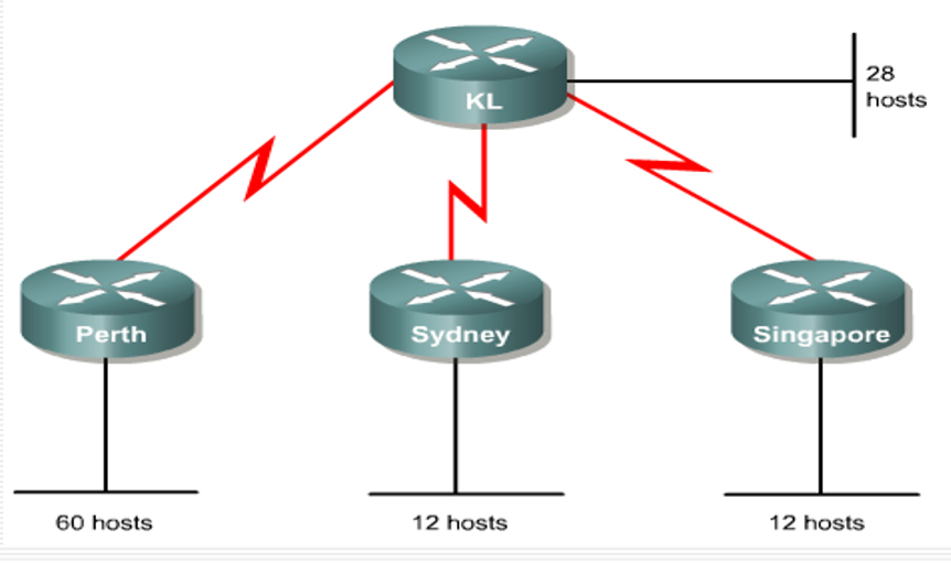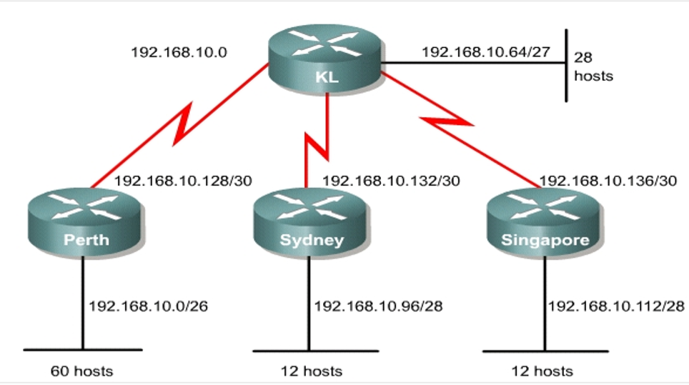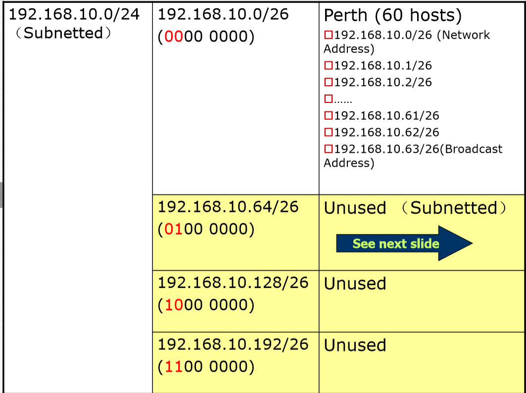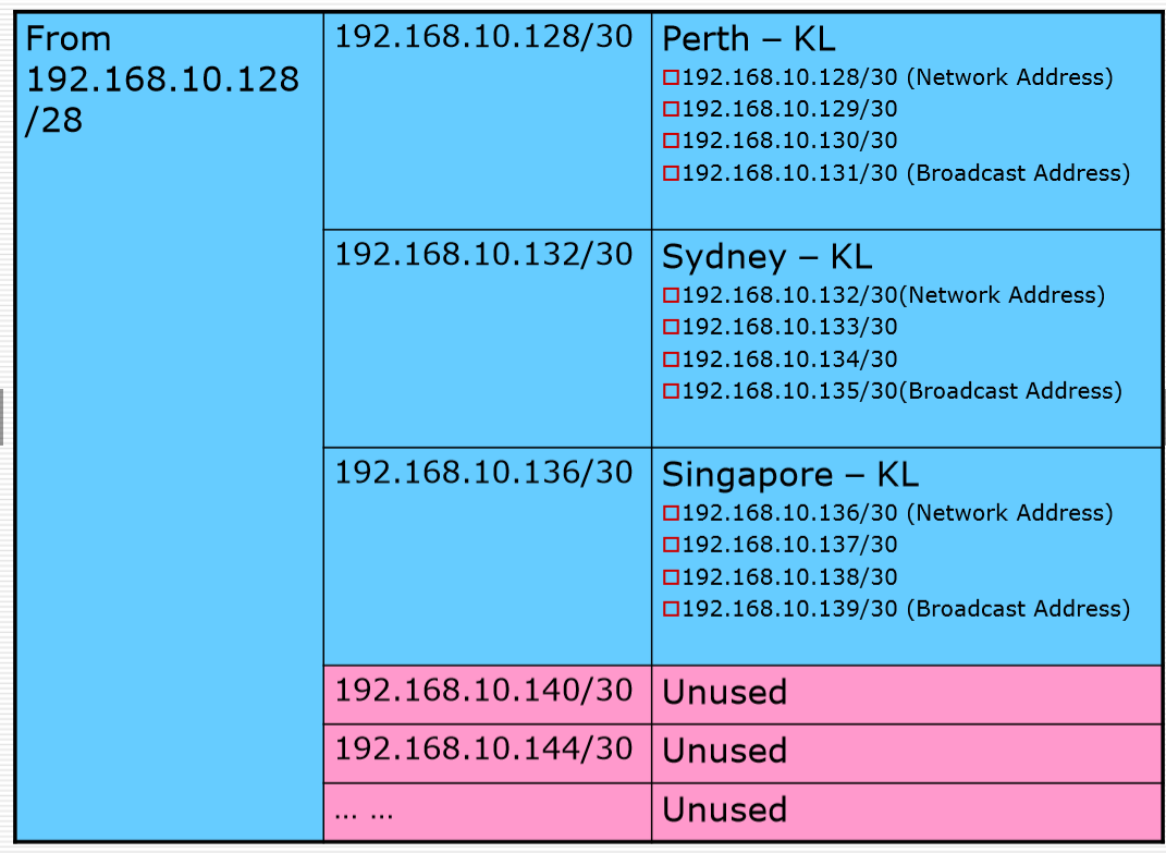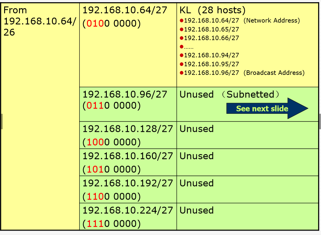 - 吉隆坡需要28台主机号。192.168.10.63/26之后的下一个可用地址是192.168.10.64/26。