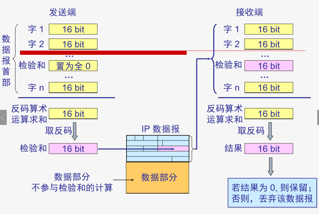 首部检验和(16 bit)字段:只检验数据报的首部,不包括数据部分。这里不采用 CRC 检验码而采用简单的计算方法。算法过程如下(比较形式化的问题,并不能解决数据报错误的形式)