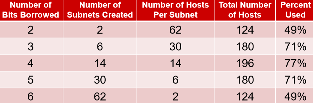 - 使用6位,因为26– 2 = 62个可用主机地址。因此,将从第四个八位位组开始使用2位来表示/26的扩展网络前缀,其余6位将用于主机地址。