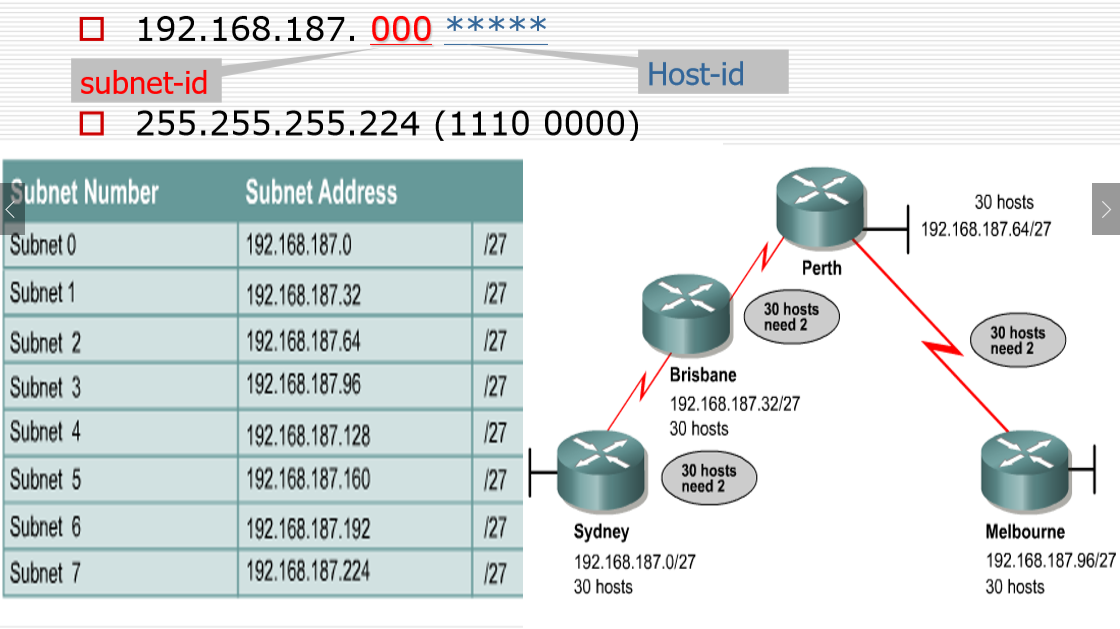 - 因此,将需要5位来表示主机,而将使用3位来表示扩展网络前缀/27