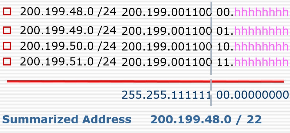 - 为了使聚合正常工作,请以分层方式(hierarchical fashion)仔细分配地址,以便汇总的地址将共享相同的高位。