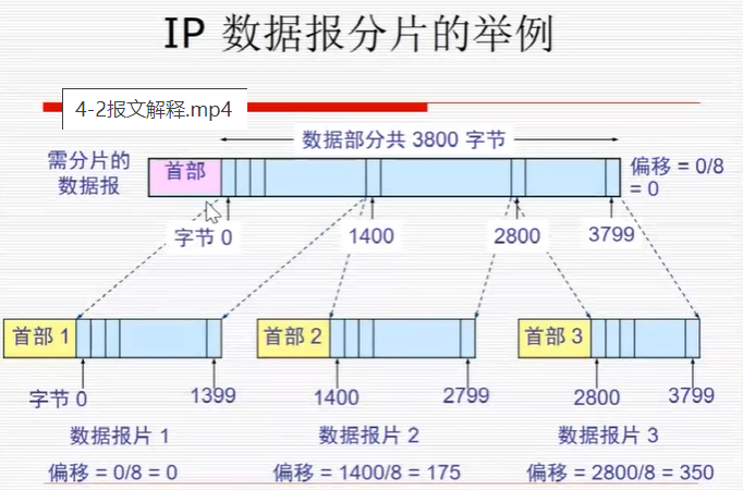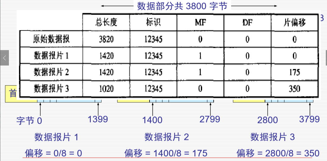 片偏移(13 bit)指出:较长的分组在分片后某片在原分组中的相对位置。片偏移以8个字节为偏移单位。
