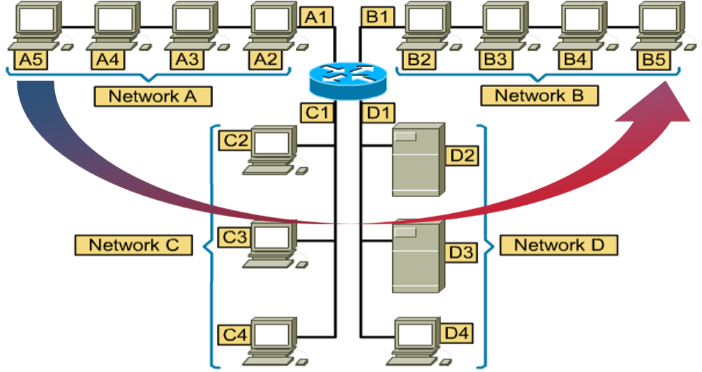 - 通过网络移动数据:不同网段之间的通信,不同的广播域,两个广播域之间的进行了划分,互不干扰,不是广播的通信以及对另一个网段的广播需要能传达给对方。