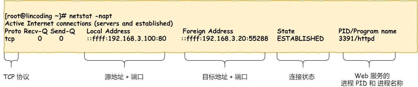 TCP 的连接状态查看,在 Linux 可以通过netstat -napt命令查看。