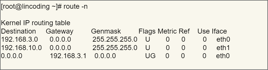 第三条目比较特殊,它目标地址和子网掩码都是0.0.0.0,这表示默认网关,如果其他所有条目都无法匹配,就会自动匹配这一行。并且后续就把包发给路由器,Gateway即是路由器的 IP 地址。