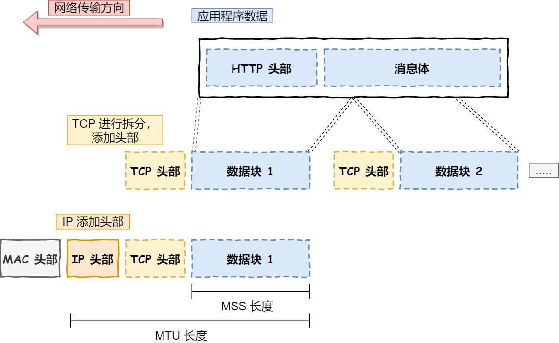 如果 HTTP 请求消息比较长,超过了MSS的长度,这时 TCP 就需要把 HTTP 的数据拆解一块块的数据发送,而不是一次性发送所有数据。