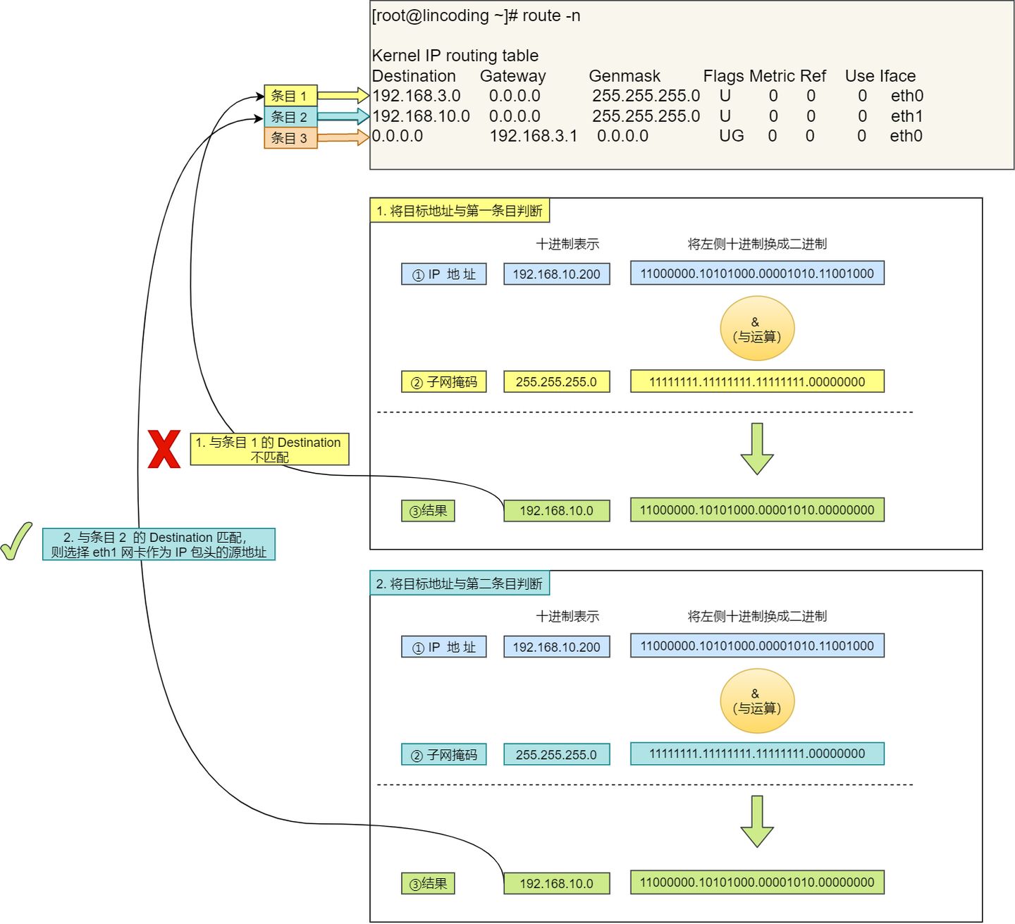 Genmask)进行与运算,得到结果为192.168.10.0,但是第一个条目的Destination是192.168.3.0,两者不一致所以匹配失败。192.168.10.0,与第二条目的Destination 192.168.10.0匹配成功,所以将使用eth1网卡的 IP 地址作为 IP 包头的源地址。那么假设 Web 服务器的目标地址是10.100.20.100,那么依然依照上面的路由表规则判断,判断后的结果是和第三条目匹配。