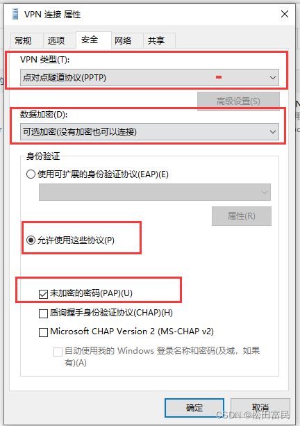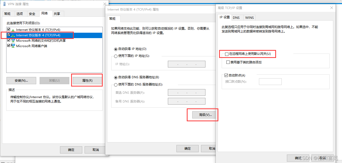 (4)配置VPN的路由,取消“远程网上使用的默认路由”,否则本机上互联网中断