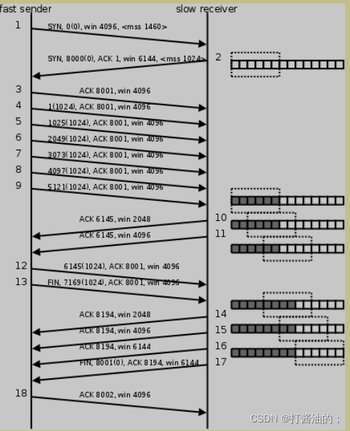 上面的插图描述了1K数据,在接收端有一个小方形。已经收到的数据以一小平方块的固体大小表示。缓冲区的接受程度以虚形框架显示。因此,窗口大小由虚边框中的空小方形表示。从图中可以看出,由于数据被程序删除,点框移到右边。因此称为滑动窗口。