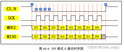 如下图所示,主机视角的通信时间序列。主机控制SSCK,MOSI和CS_N信号时钟信号由SCK表示。用以同步数据,MOSI是接收机器信号的主机输出主机通过此信号线向机器发送数据 。影片的信号由 CS_N 选择 。用以选定从机设备,当MISO信号由机器生成时,低高度是有效的。主机使用信号线从机器读取数据。MOSI和ISO只有在CS_N值低时才有效。每个SCK时钟周期传输一个数据包 。