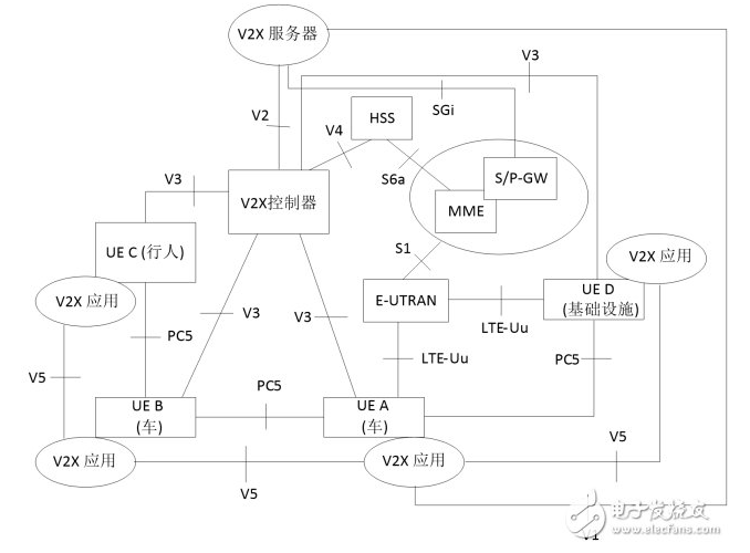 1) PC5(直接-链接通信界面):端对端通信界面,即车辆、个人和道路基础设施之间的短距离直接通信界面;其特征是:在直线连接、广播和网络发送方面,低时间延误、高容量和高可靠性通信。