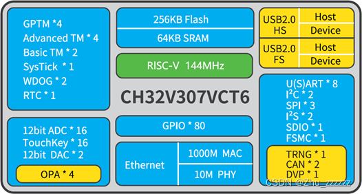 V307是RISC-V自我研究的RISC-V连通性MCU,表现良好。主要频率为144兆赫。支持硬件浮动点操作(FPUs) 。PHY收发报机、Giga Ethernet MAC,以及10 M HYs和2 CAN接口的丰富的外部资源,都拥有8个UART界面和USB2.高速连接(480 Mbps)。