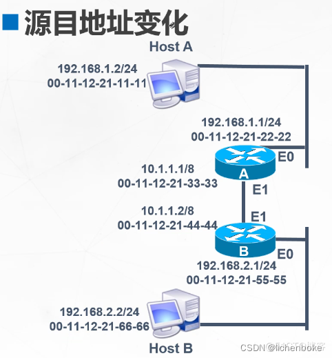 (通过道路路由器的封装过程,IP地址保持不变,但MAC不断改变。 )