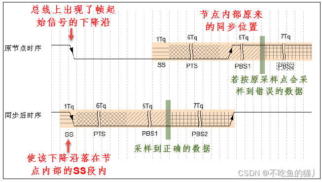 当所有接收到的节点调整其当前在 SOF 位的位置时,同步段的更新宽度是无限的。 只有当框架开始信号工作时, 只有当节点信号在整个长长的数据框中偏离总线信号时, 这种同步是毫无用处的。
