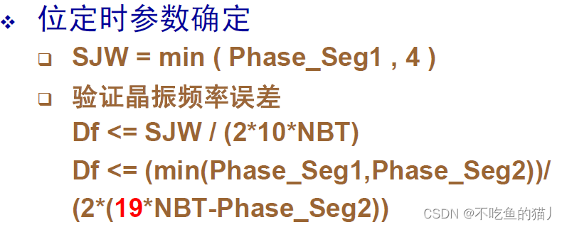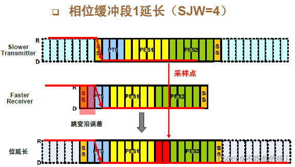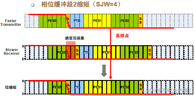 当跳跃和同步段之间的错误小于 SJW( 重复同步跳跃宽度; 重同步补偿宽度) 时, 跳跃被视为同步 。如果您重新同步, PTS1 将会延长, 但如果您再次同步, PTS2 将会缩短 。为确保取样点的位置正确,如果指定SJW = 4 Tq,当单词同步时, 它们不能增减超过 4Tq 的时间 。若有需要,将对控制器进行一系列微小的修改,使其同步。